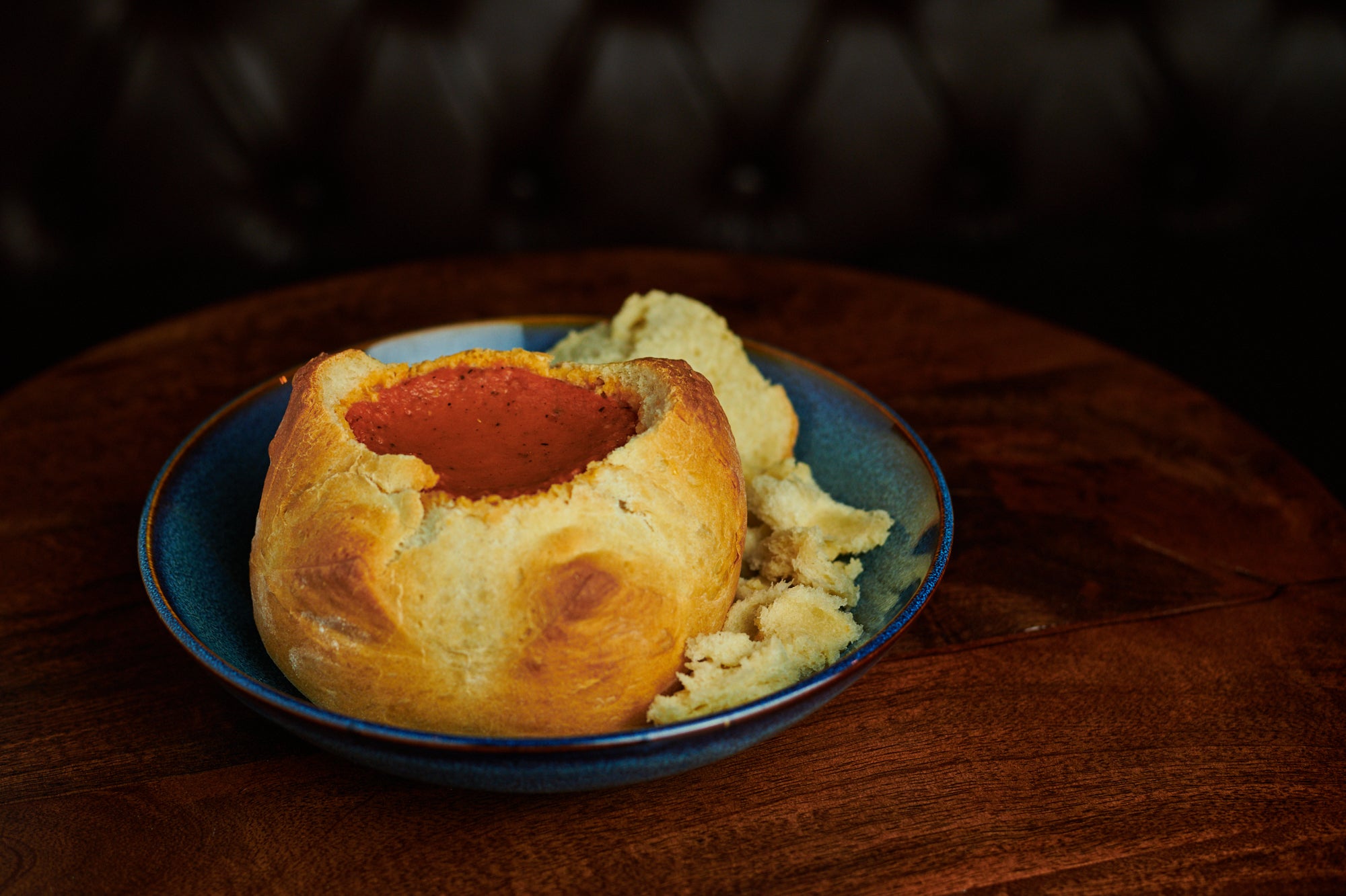 100% Vegetarian. A rich, velvety tomato bisque made fresh in house by hand. We will package it in a cup for transport. So that you may pour it into the bread bowl which will be supplied so that you ensure to have it hot and fresh as if you were enjoying it at the restaurant!