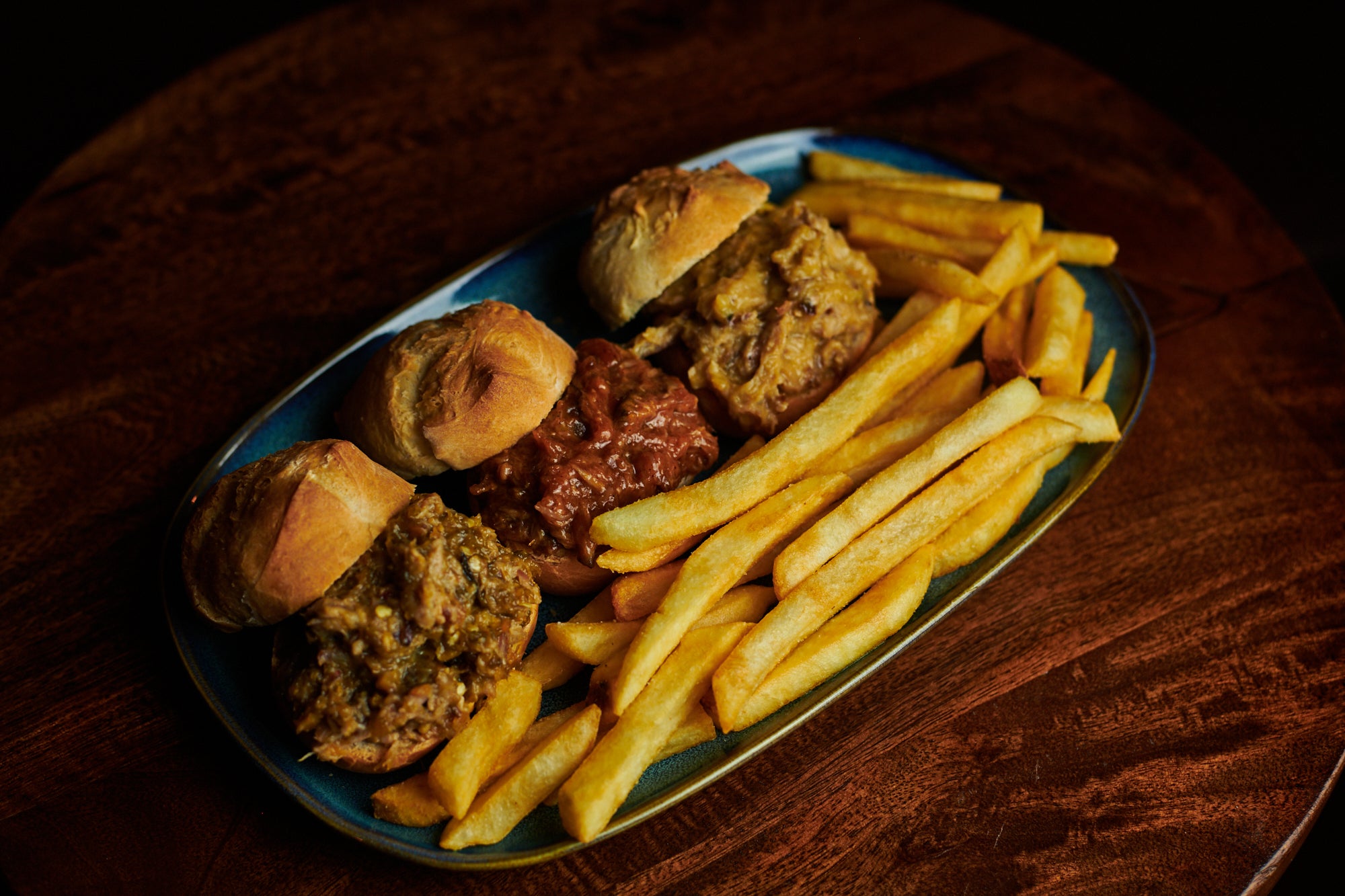Handcrafted pulled-pork sliders, brined and slow roasted in house, each piled high with slow-cooked, tender pork infused with your choice of house sauce. Served on our fresh-baked artisan rolls. Accompanied by a small helping of Spears.